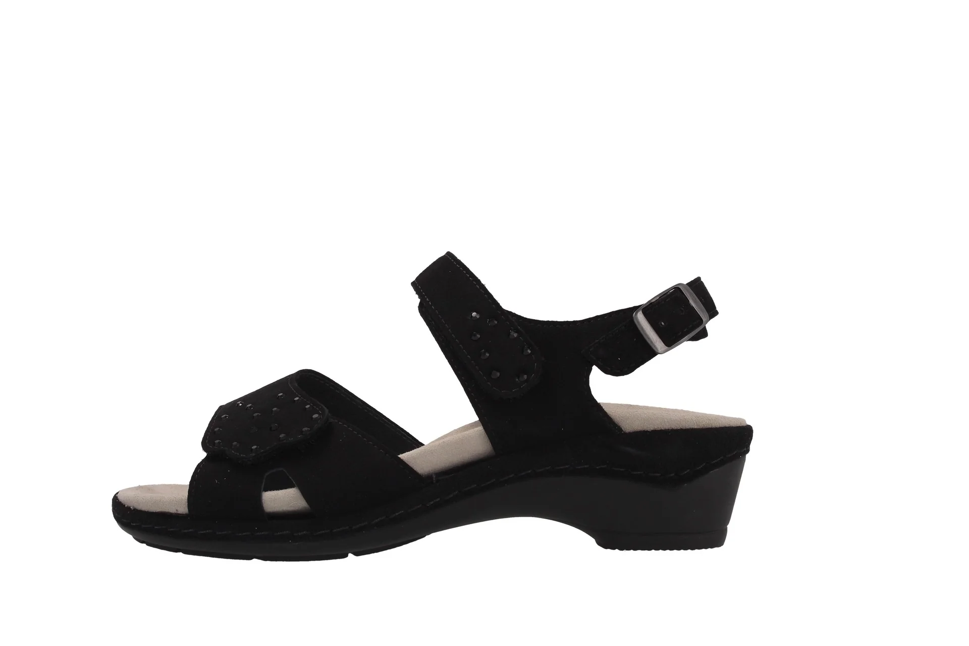Bequeme Sandale für Damen in schwarz aus geschmeidig weichem Nubukleder. Das Innenfutter besteht aus anschmiegsamen echt Glattleder. Die herausnehmbare Decksohle (befestigt durch Klettverschlüsse) besteht aus feinem Velourleder und verfügt über ein Komfortfußbett. Die leichte Laufsohle mit integrierten Luftpolstern aus leichtem PU ermöglicht einen angenehmen Tragekomfort, der kleine Absatz misst 35mm. Über zwei praktische Klettverschlüsse und eine verstellbare Dornschnalle mit Druckknopf lässt sich der Schuh optimal an den Fuß anpassen. Dieser Schuh hat die Komfortweite K und ist wunderbar für einen festen Fuß geeignet.